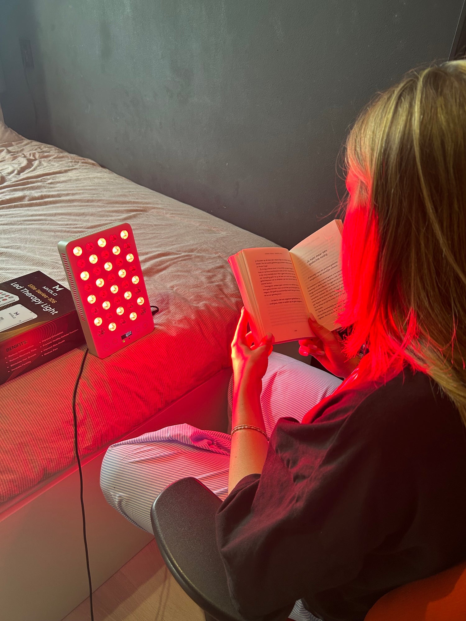 The Mvolo Red Light Elite Series 106 is an advanced LED infrared lamp designed to help with various complaints such as; skin problems (acne, eczema, scars and wounds), collagen & elastin production, increasing energy, reducing stress, etc. In addition, it improves your general well-being and beauty through red and near infrared therapy.